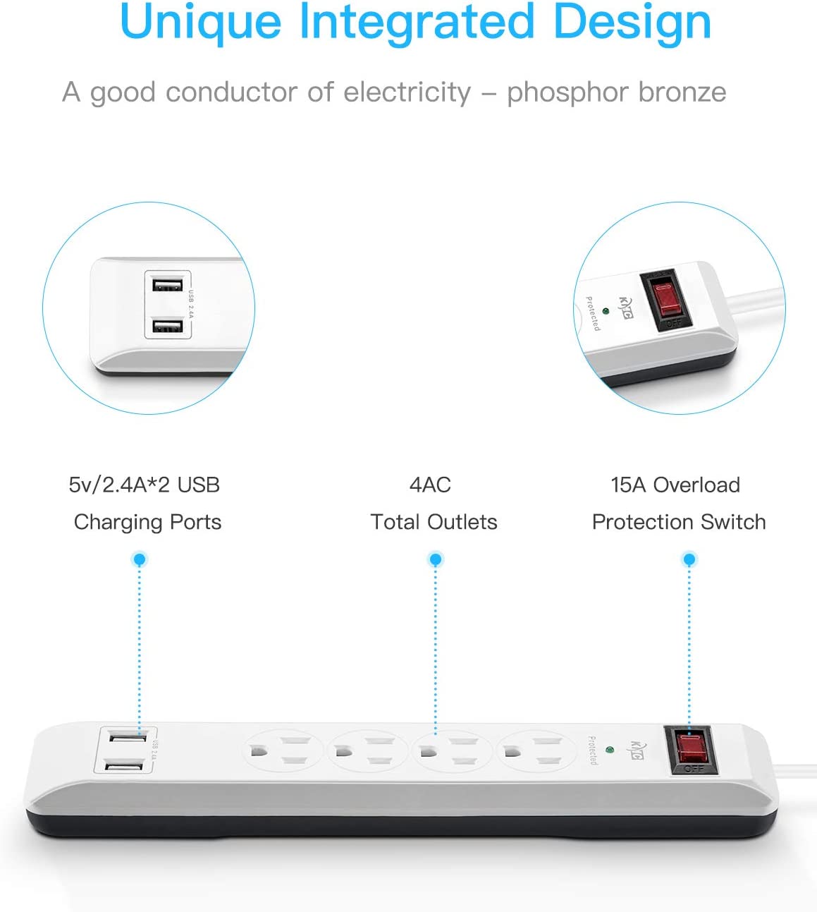 The KMC surge protects strip that houses two standard USB ports with a 2.1A output current. You can use the strip to connect appliances on four outlets and charge multiple devices such as cellphones, cameras, torches, and other DC battery devices with USB ports. The back of the power strip is provided with Pinhole so you can hang it on walls.