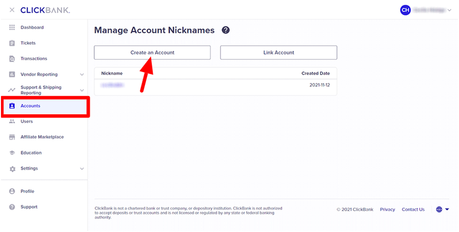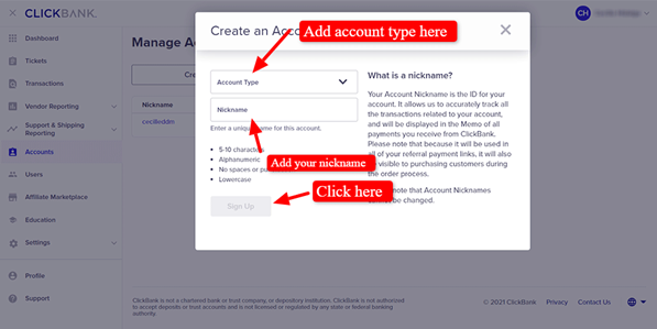After that choose affiliate from the drop-down menu, enter your nickname, and click on the signup button to make your affiliate account on Clickbank.